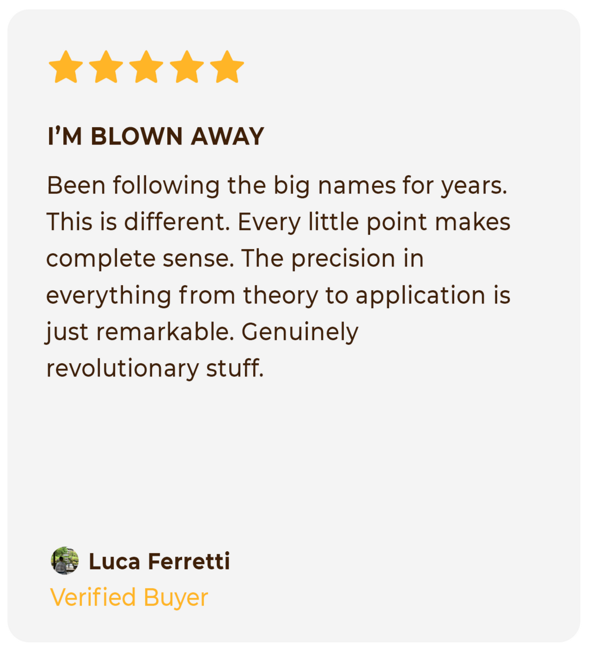 The average program with this much stuff inside is €800-€1200.The starting package rate for my private coaching is €1800 (12.2x this entire program, that is yours for life).PS - This is much more valuable than coaching anyway because you become autonomous for life.This is the first time this level of information has been made accessible to everyone.